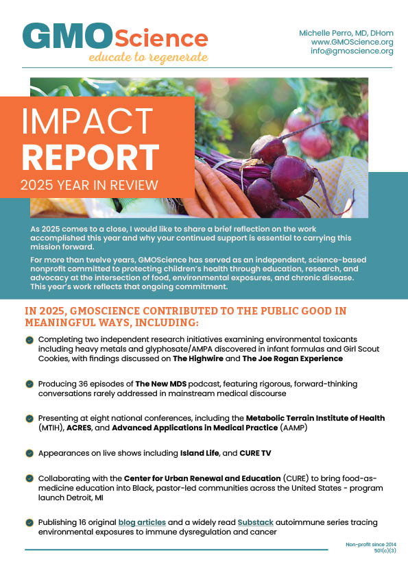The recognition that families need guidance from trustworthy, yet authoritative sources, birthed our podcast The New MDS: Mothers, Doctors, and Scientists, featuring GMOScience Advisory Board Members, Zen Honeycutt, GMOScience co-founder and CEO, Michelle Perro, MD, and Dr. Stephanie Seneff respectively, creating a monthly podcast with featured guests on germane topics for parents.