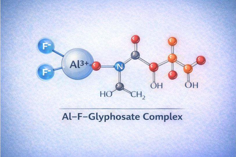 In the presence of aluminum (Al³⁺), fluoride (F⁻) and glyphosate bind tightly to form a stable molecular structure known as an Al–F–Glyphosate complex. This can occur in acidic soils, water pipes, or inside living tissue.